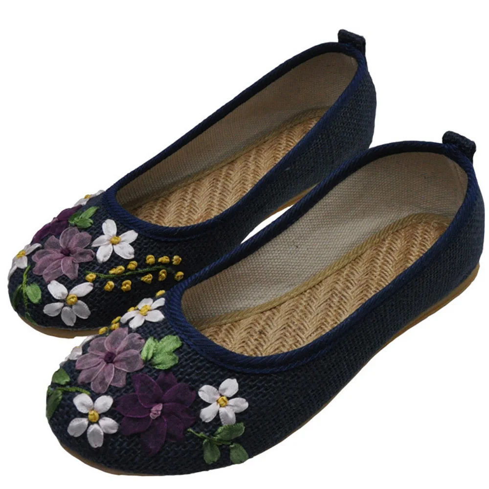 .image for Vintage Embroidered Women Flats Flower Slip On Cotton Fabric Linen Comfortable Old Peking Ballerina